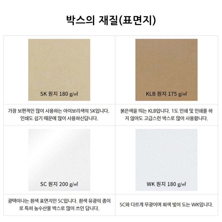 표면지는 일반적인 SK 원지, 고급지인 KLB 원지, 밝은회색인 WK 원지, 유광인 SC 원지가 있으며,